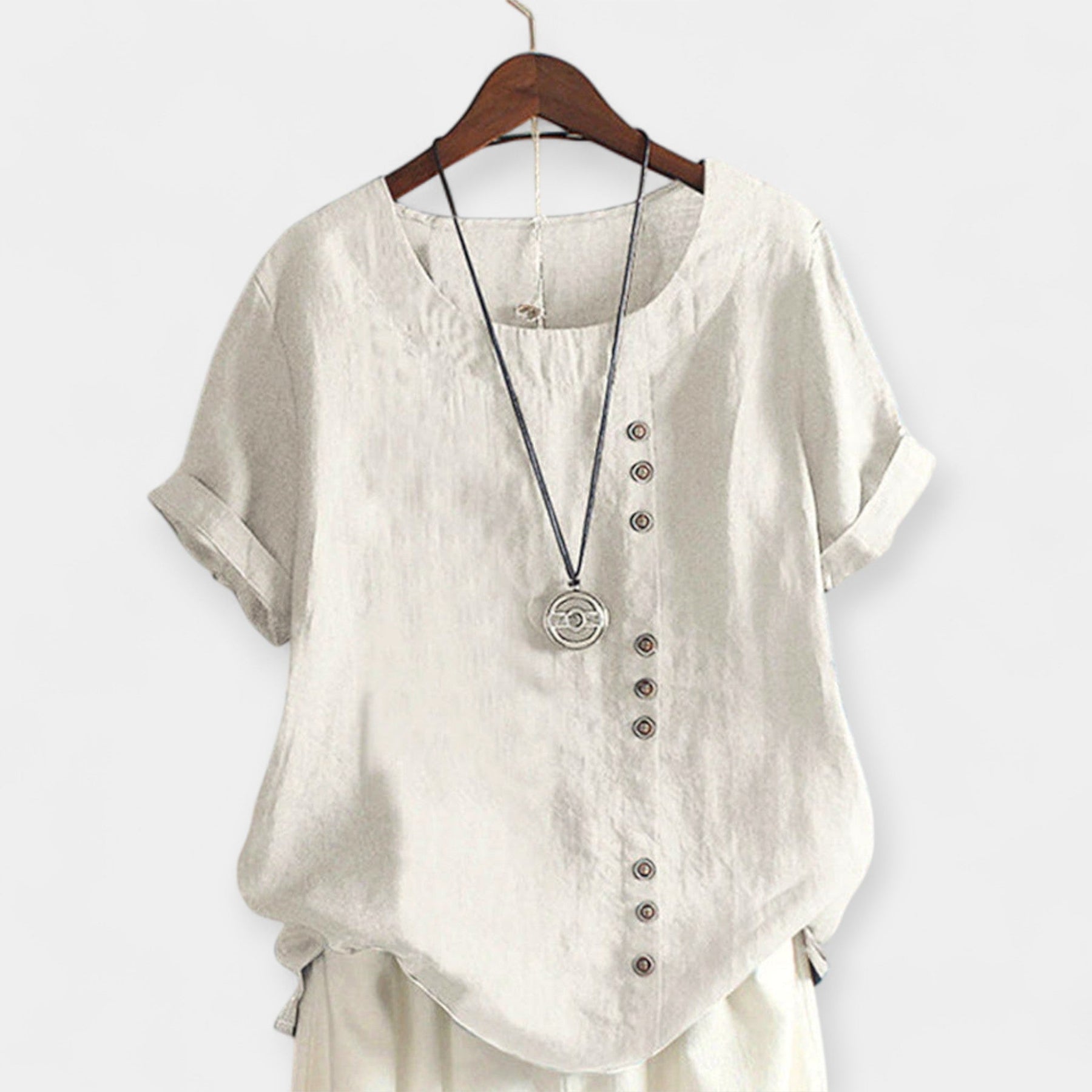 Užite si pohodlné chvíle so štýlom v tejto elegantnej, jednofarebnej blúzke s okrúhlym výstrihom a gombíkmi. Ideálna na každú príležitosť, od každodenných prechádzok po meste až po formálnejšie vystúpenia, kombinuje kvalitu, pohodlie a nadčasovosť.