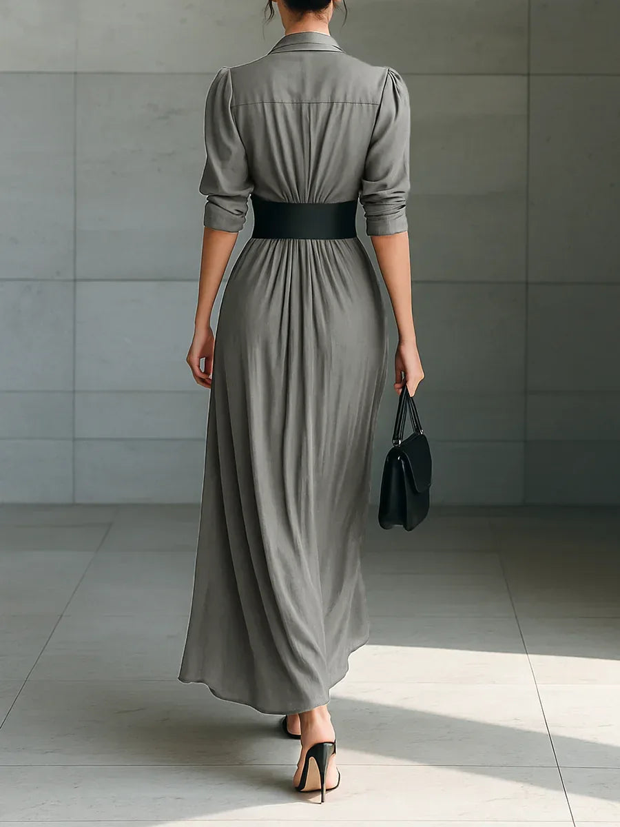 Este vestido camisero maxi está pensado para mujeres que querem sentirse poderosas sin renunciar a la comodidad. El escote en pico, los botones frontales y el cinturón ancho marcan la cintura y crean una silueta esbelta y sofisticada, mientras que la falda larga y fluida acompaña cada paso con movimiento natural. Perfecto para la oficina, cenas especiales o eventos donde quieras destacar con un estilo discreto pero muy refinado.