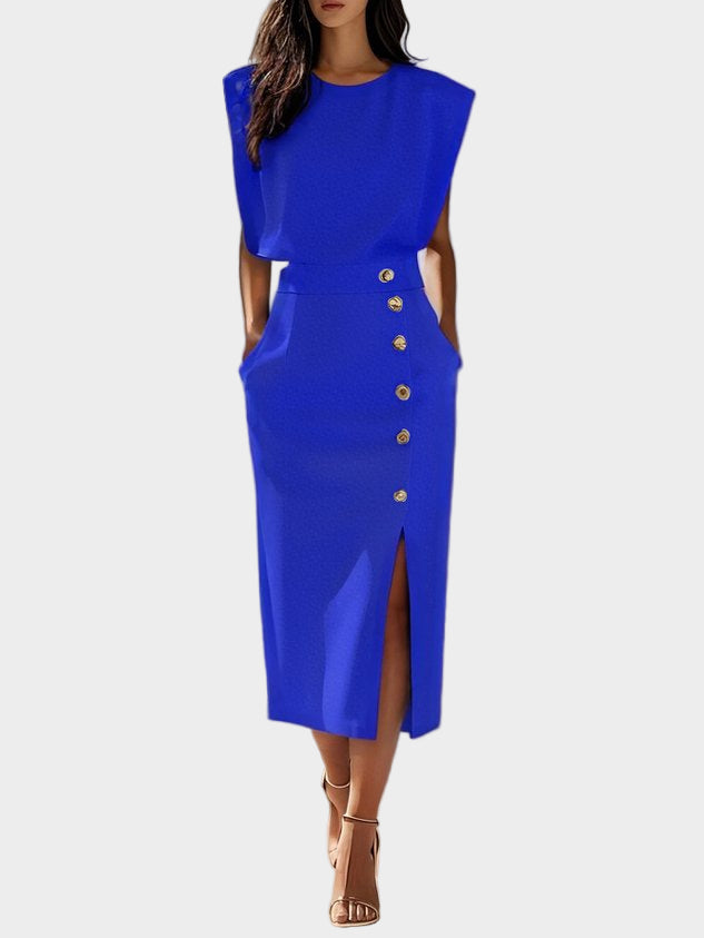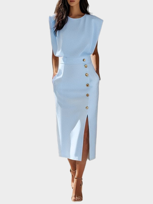 Jednofarebné midi šaty s rozparkom a okrúhlym výstrihom