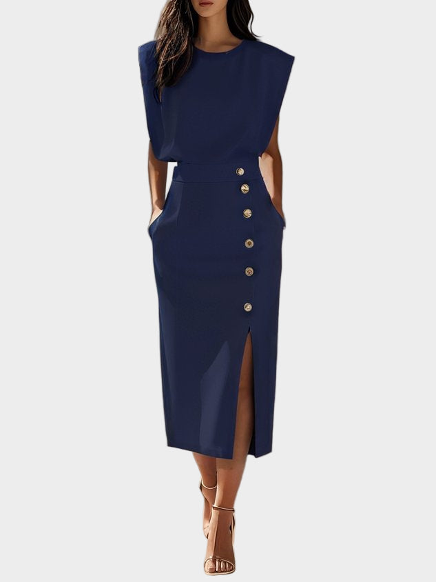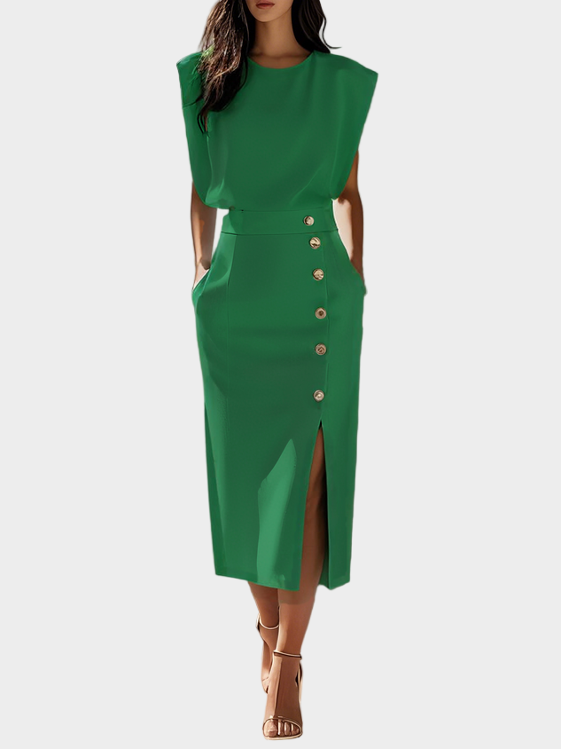 • Midi dĺžka s rozparkom: Vyvažuje eleganciu s ženským charakterom.