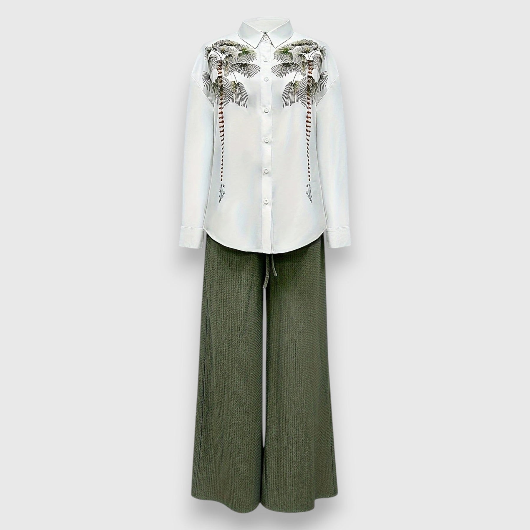 Súprava Nivana kombinuje elegantnú blúzku s jemným kvetinovým vzorom a voľné nohavice so širokými nohavicami – ideálne na štýlové dni. Ľahký materiál a vysoký golier dodávajú celku ženský a náročný nádych.